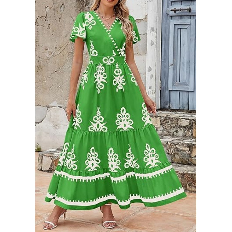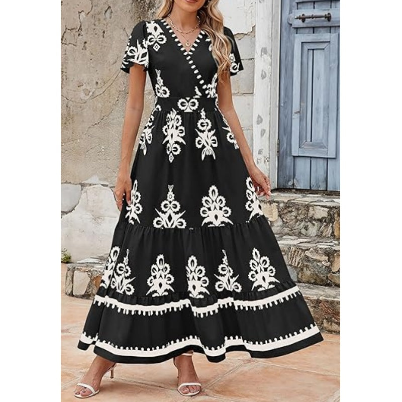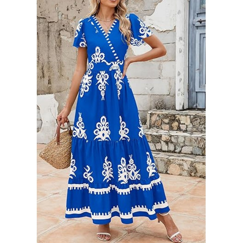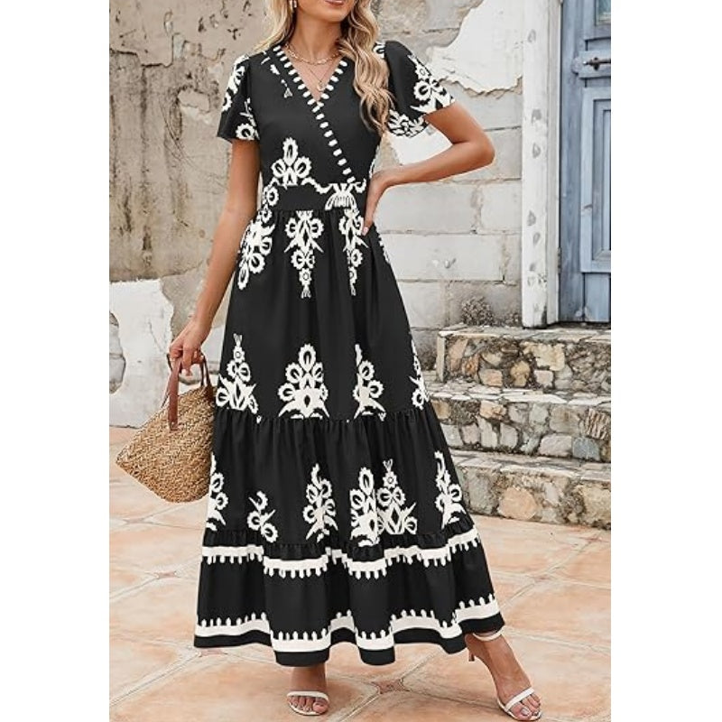 FASHIONABLE & VERSATILE: This boho maxi dress features a trendy printed design and a flattering V-neckline, making it perfect for any occasion. Pair it with sandals for a casual look or dress it up with heels for a night out—it’s your go-to outfit for effortless style.