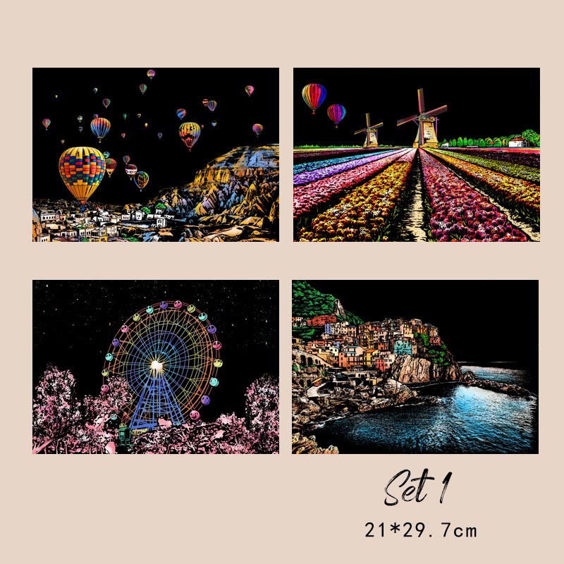 FUN & CREATIVE DIY ART EXPERIENCE: This set includes 4 beautifully designed scenes, offering a fun and relaxing creative activity. Unleash your inner artist as you reveal beautiful cityscapes by scratching off the dark coating.