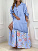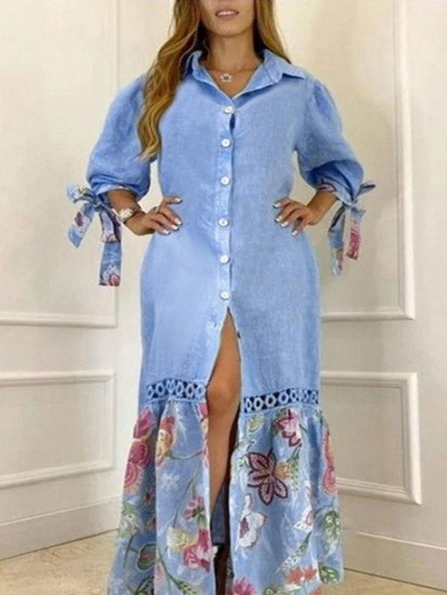 LUNE Women's Casual Lace Patchwork Floral Printed Sleeve Cuff Ribbon Belted Shirt Dress (Random Print)