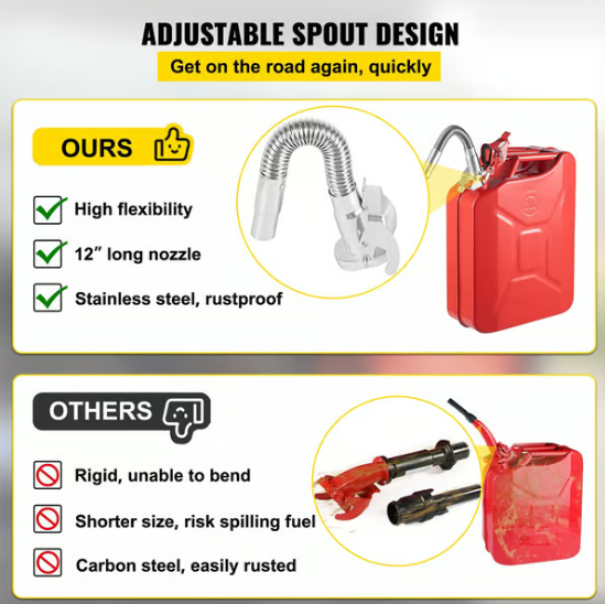 ā½ļøSmooth pouring:Ā The spout of the metal can is equipped with a mesh filter in the spout to prevent dirt/debris from entering the fuel system.