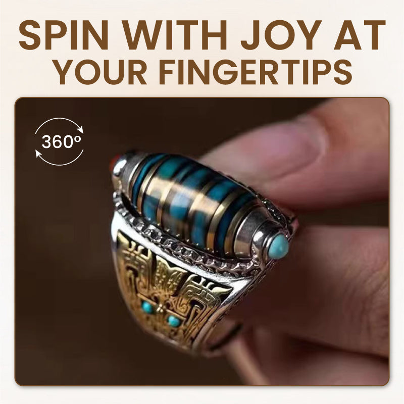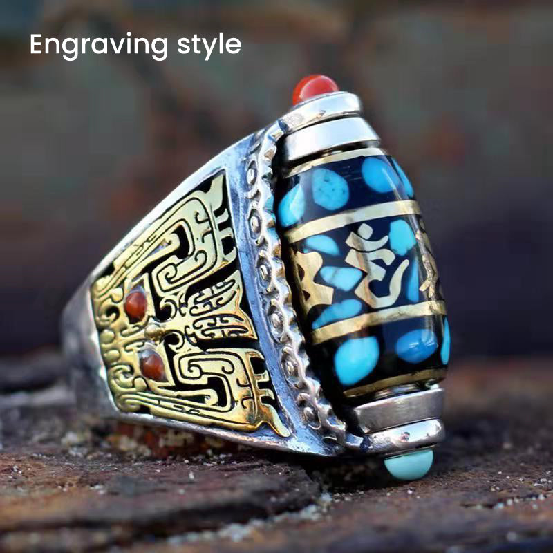 Turquoise Six-character Mantra Nine-eyed Dzi Bead Ring