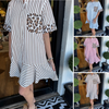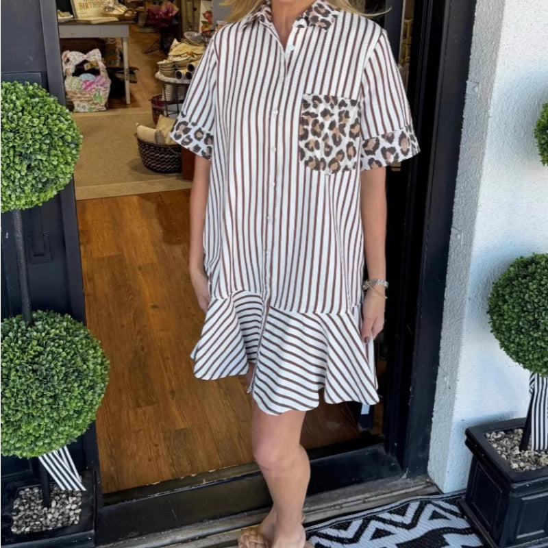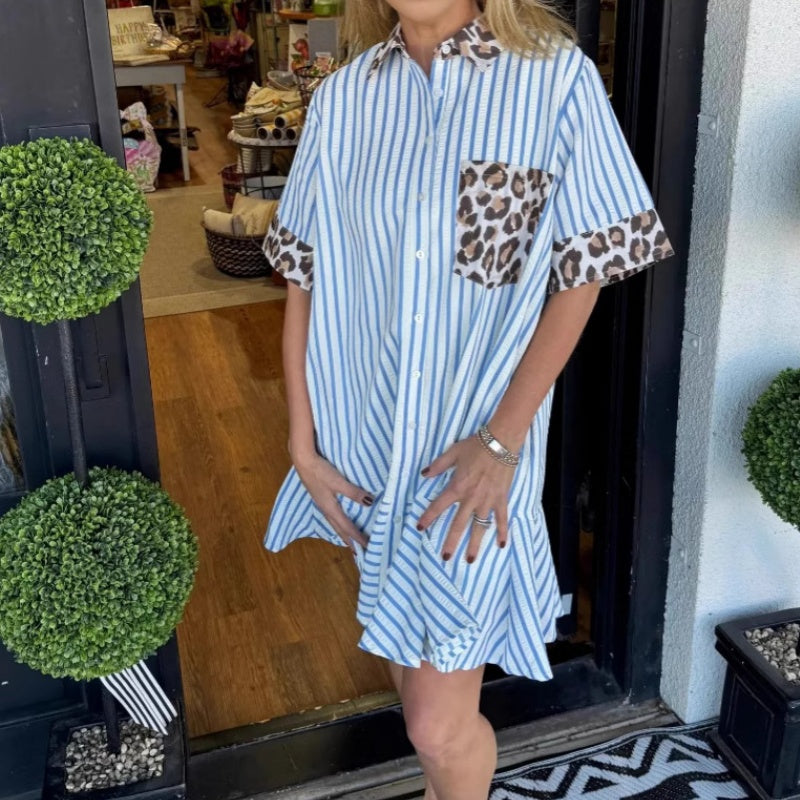 Women's Fashion Striped Patchwork Leopard Print Shirt Dresses