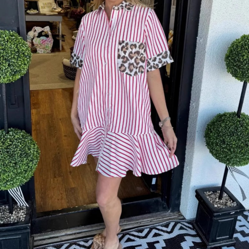 1 × Women's Fashion Striped Patchwork Leopard Print Shirt Dress