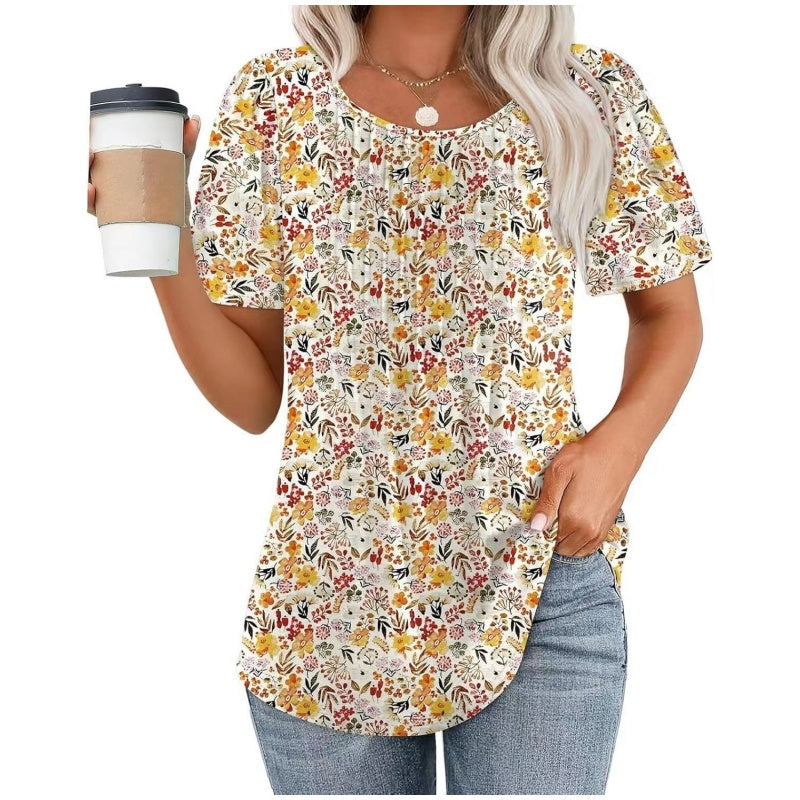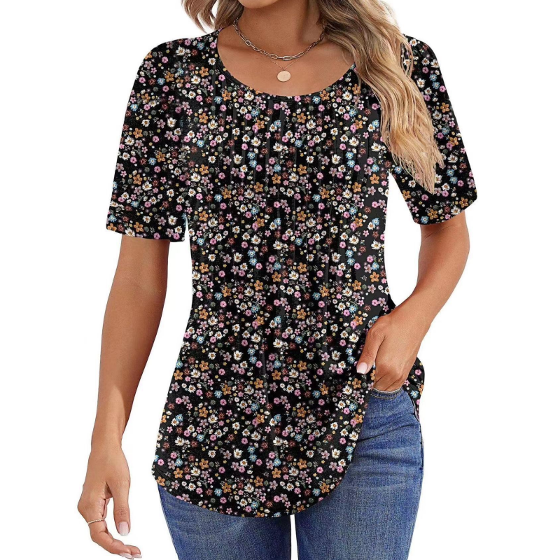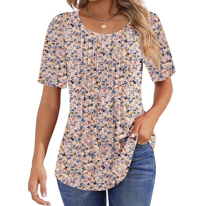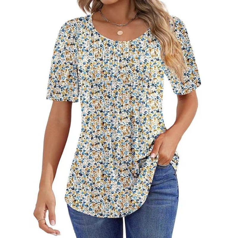 🔥2025 HOT SALE 50% OFF🔥 Round Neck Pleated Short Sleeve Printed T-Shirt