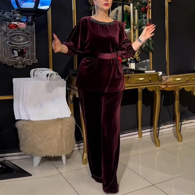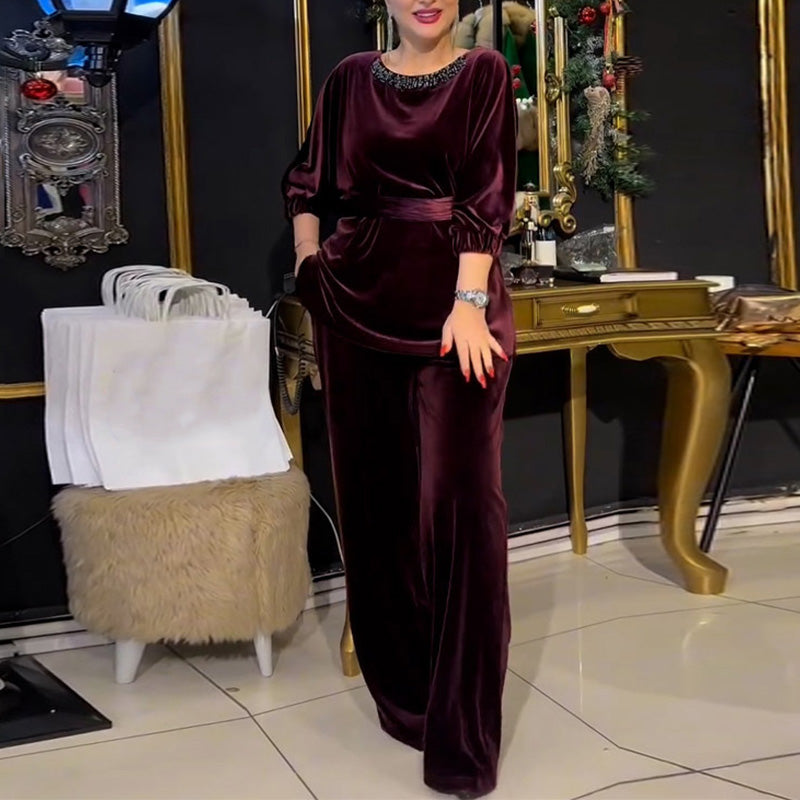 Round Neck Rhinestone Top & Wide-Leg Pants 2-Piece Set