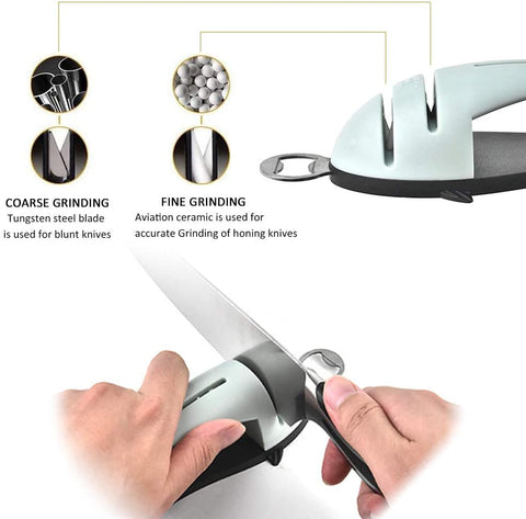 Fine Sharpening Slot equipped with aerospace ceramics for polishing, sharpening, and brightening edge; Coarse Sharpening Slot equipped with tungsten steel blades for sharpening old knife-edge and a very blunt knife.