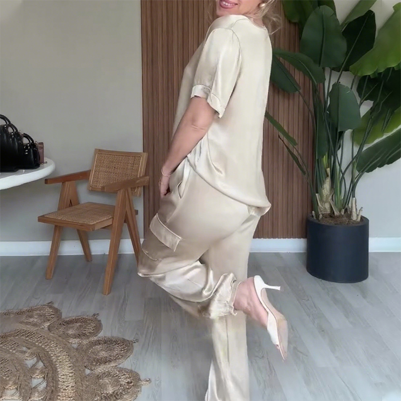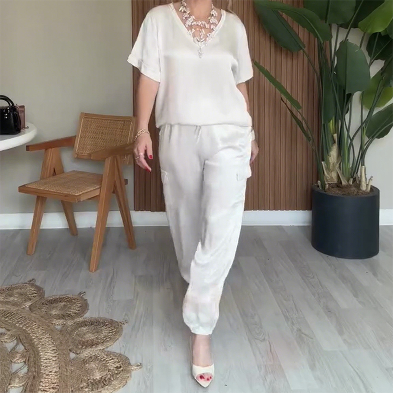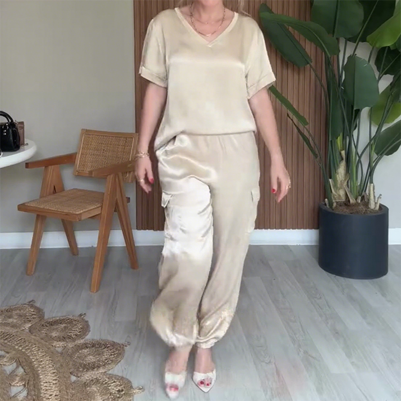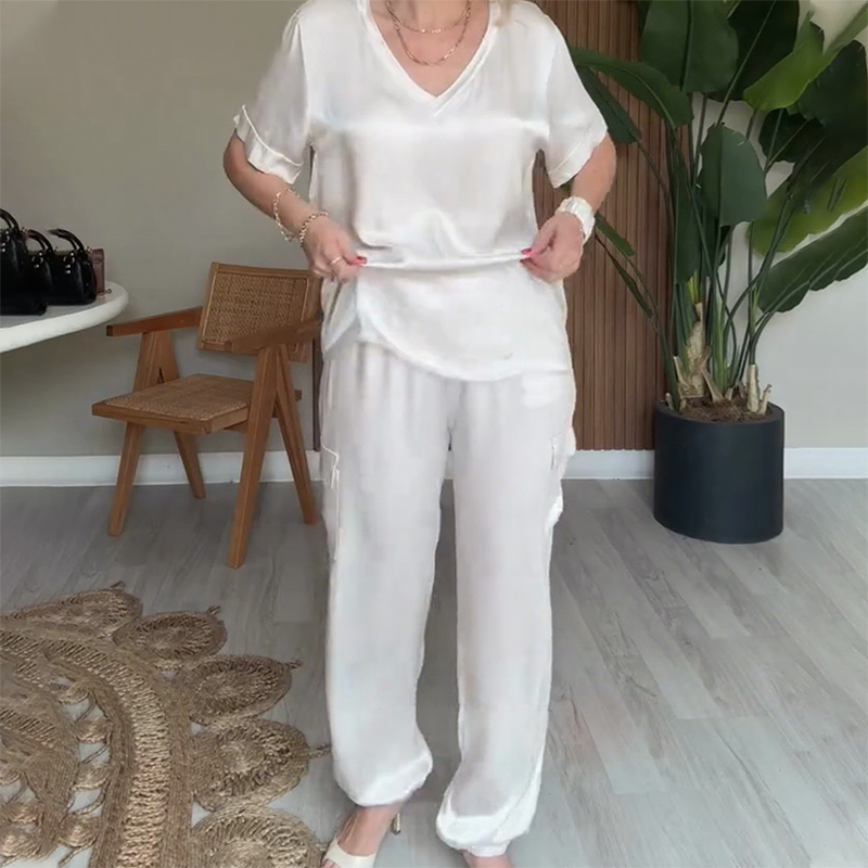 LIQUID COMFORT - Draped in silky-soft fabric with a subtle satin glow, this set feels as divine as it looks. Lightweight and breathable, it keeps you cool and comfortable from sunrise to sunset.