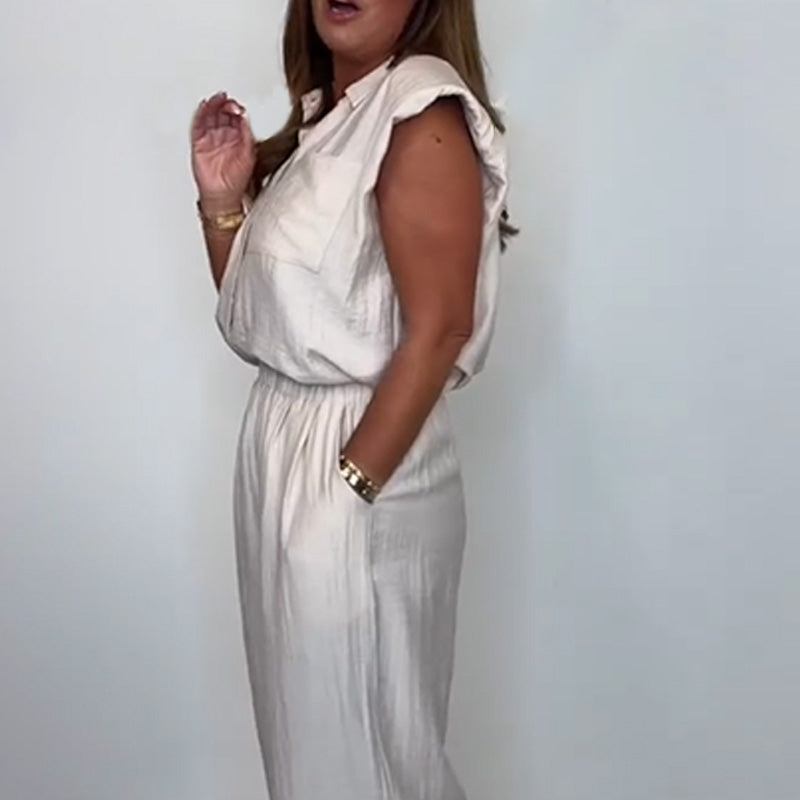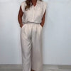 EFFORTLESS ELEGANCE – Crisp lapel-collar sleeveless shirt meets breezy wide-leg pants for a polished yet relaxed vibe. Crafted in airy cotton linen, this set balances sophistication with comfort, perfect for garden parties, brunch dates, or sunny weekends.