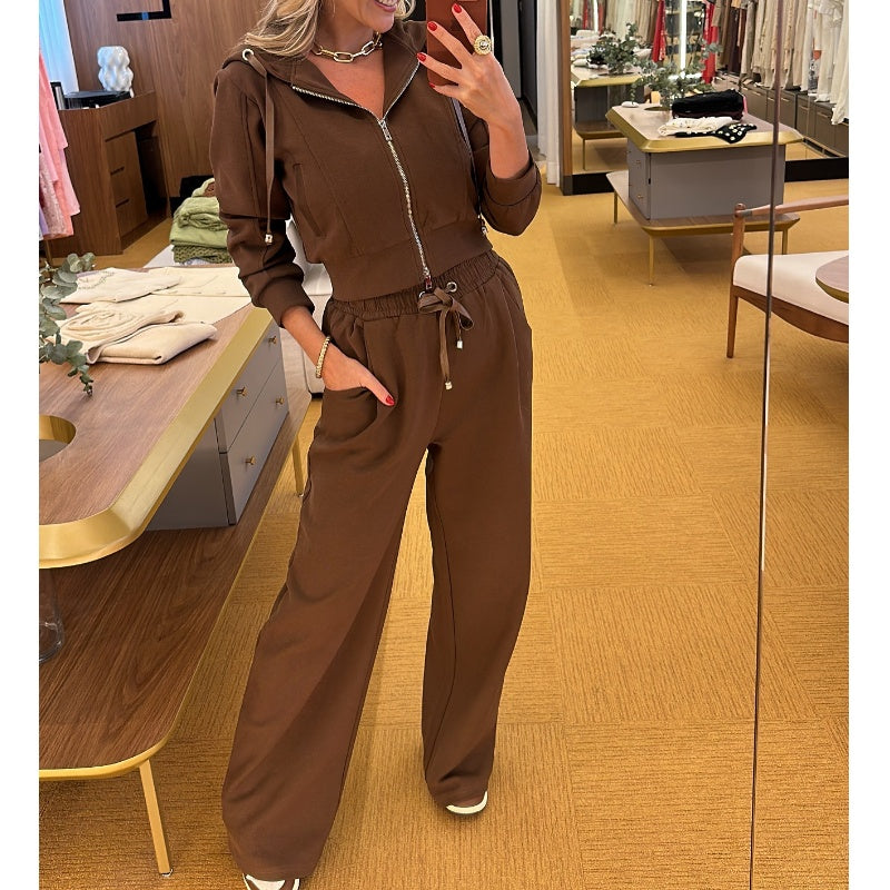 Solid Zip-Up Short Hoodie & Drawstring Pants 2-Piece Set