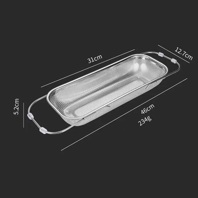 ADJUSTABLE FIT FOR VARIOUS SINKS: Features a telescopic dual-ear design that expands and contracts to fit different sink sizes. Equipped with non-slip silicone dots that securely grip sink surfaces, preventing movement during use and ensuring stability while washing or draining.
