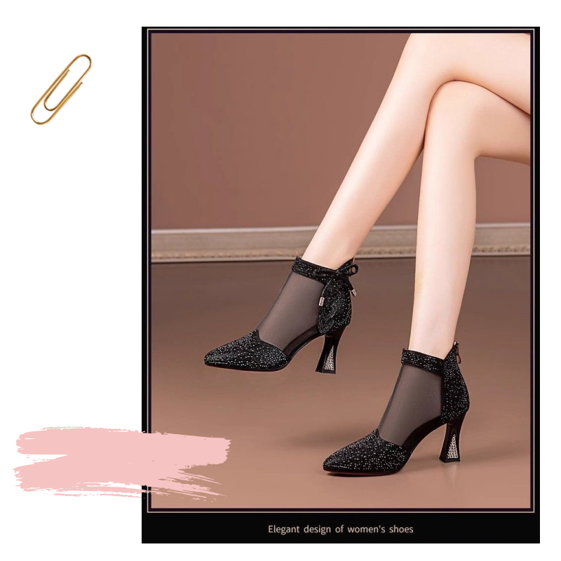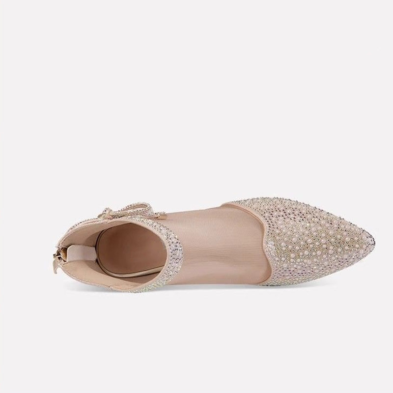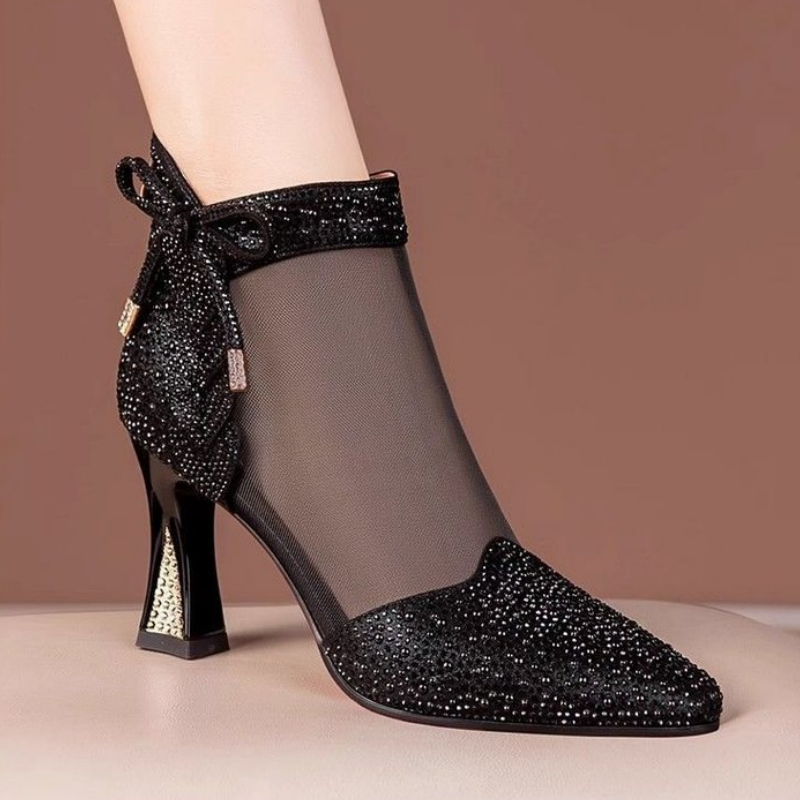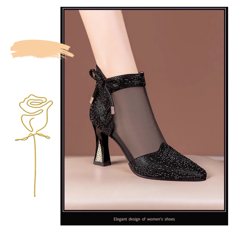 EYE-CATCHING DESIGN ELEMENTS: Make a bold fashion statement with intricately designed mesh panels accented by sparkling rhinestones, blending allure and elegance. The pointed toe and delicate bow detail enhance femininity and refinement, turning every step into a highlight.