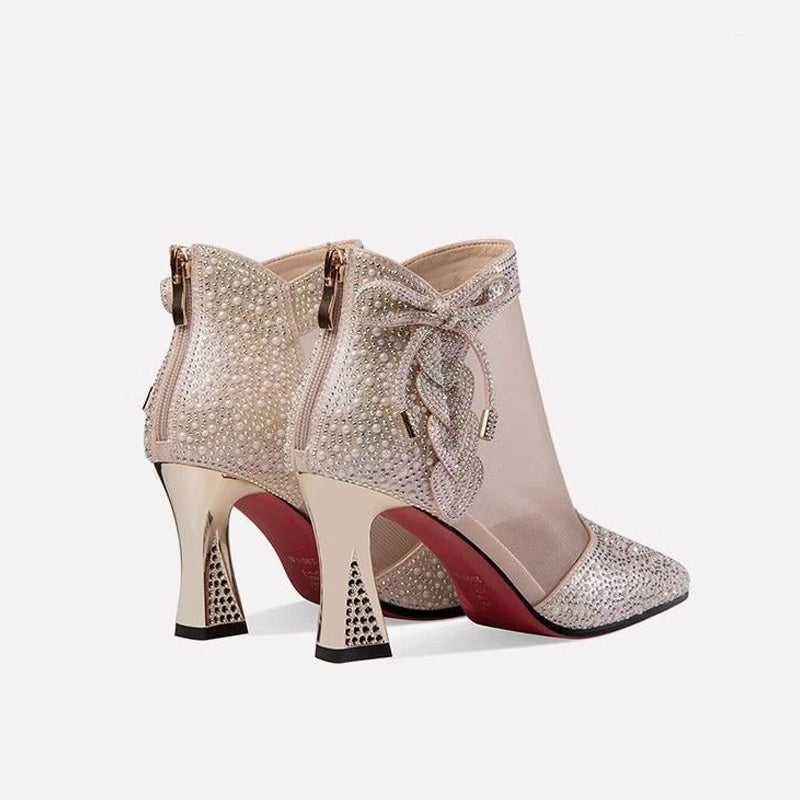Stylish Block Heel Rhinestone Mesh Ankle Boots