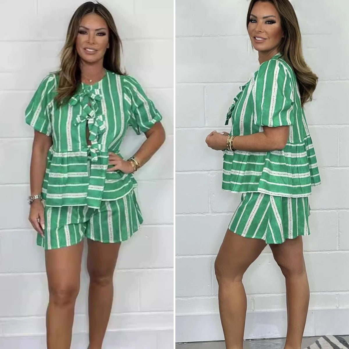WHITE STRIPES MEET BOW TIE CHARM - Crisp mint-green fabric dances with preppy white stripes, topped with a dainty bow-tie neckline. Perfect for picnics or city strolls, this set balances playful elegance with a touch of retro flair—sunshine meets sophistication.