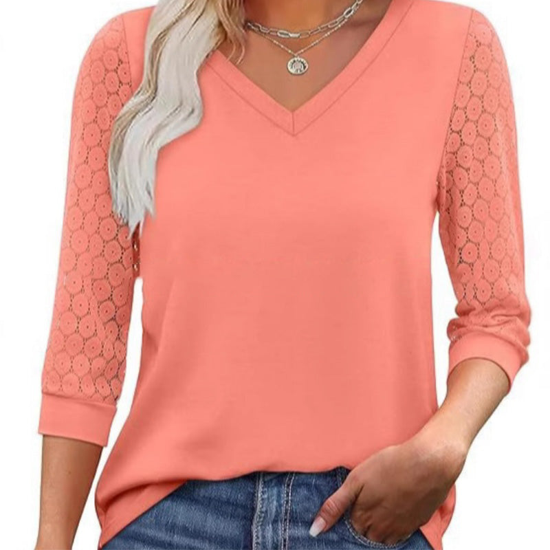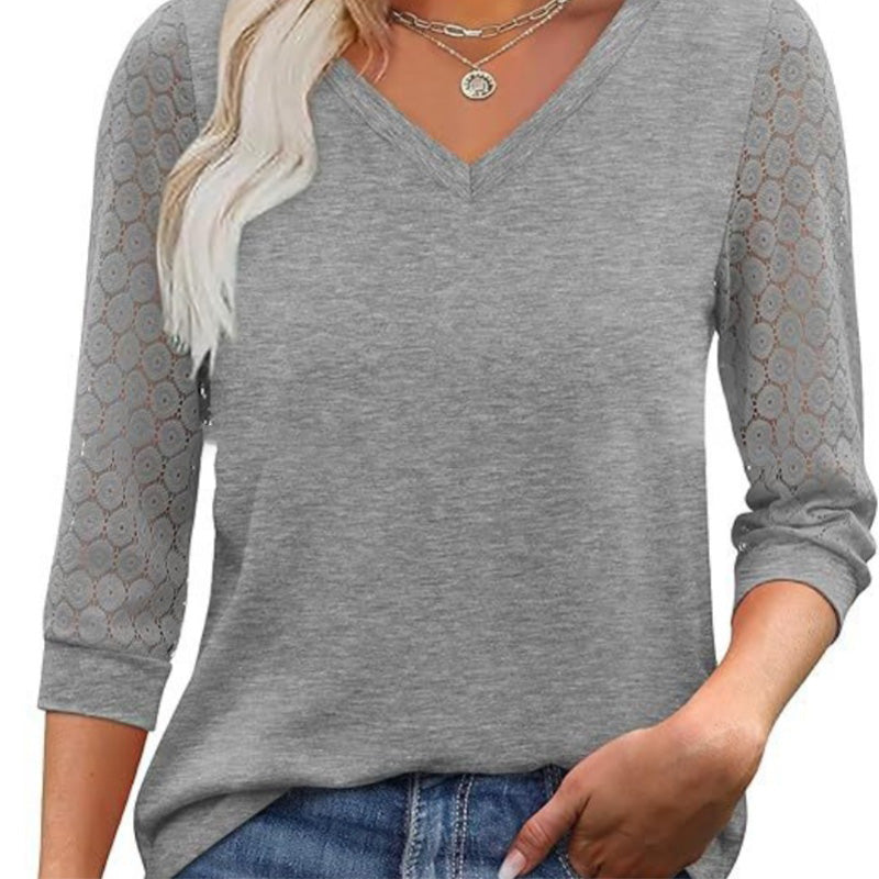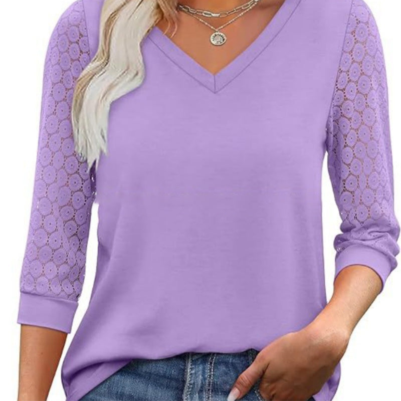 Women's Casual V-Neck Lace 3/4 Length Sleeve Top