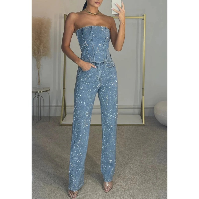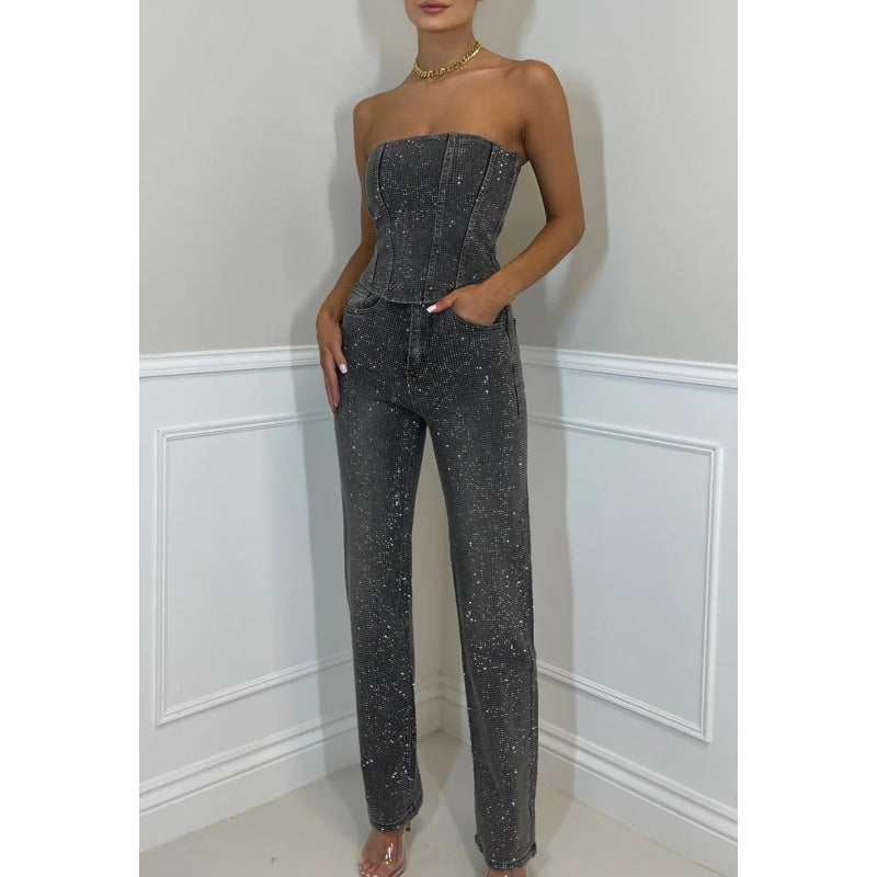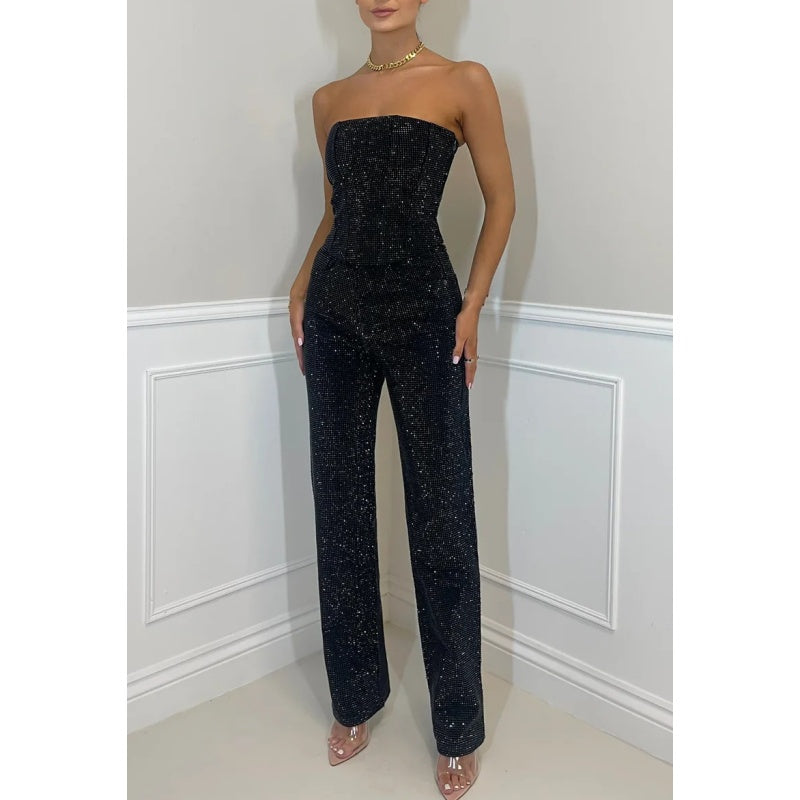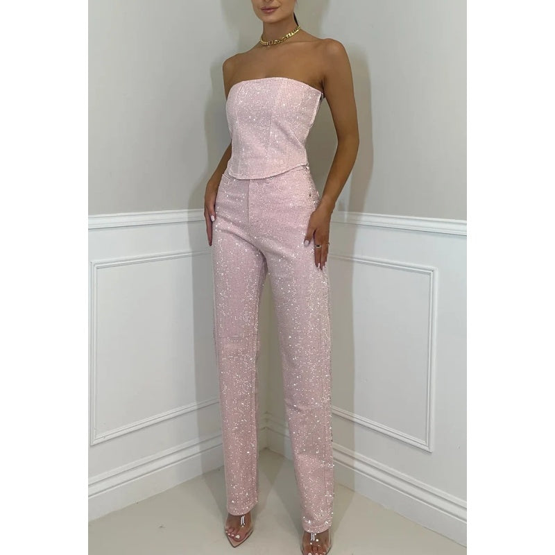 GLITTERY GLAMOUR - The top and pants set is a beacon of sparkly allure. Glitter accents shimmer, making it perfect for parties or nights out, adding a touch of elegance to any ensemble with that inimitable glittery charm.