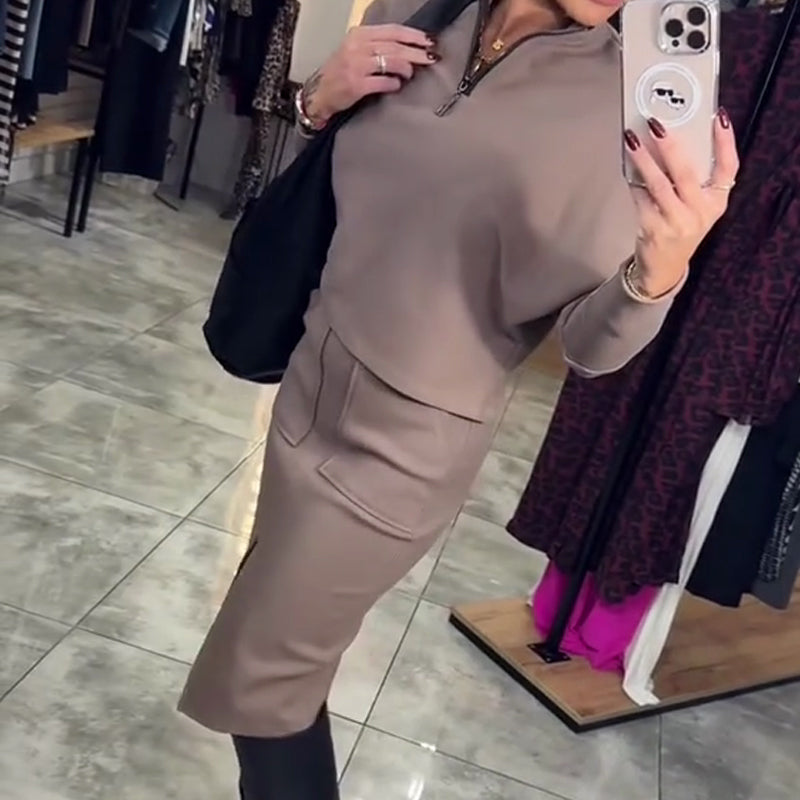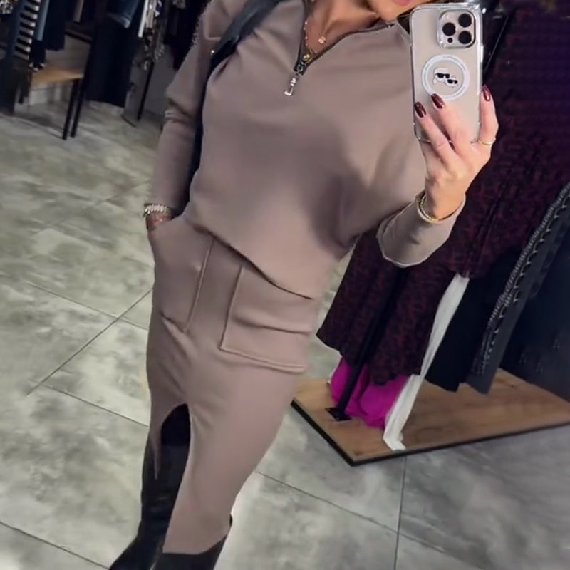 Women's Casual Half Zip Tops & Slit Skirt 2-Piece Set