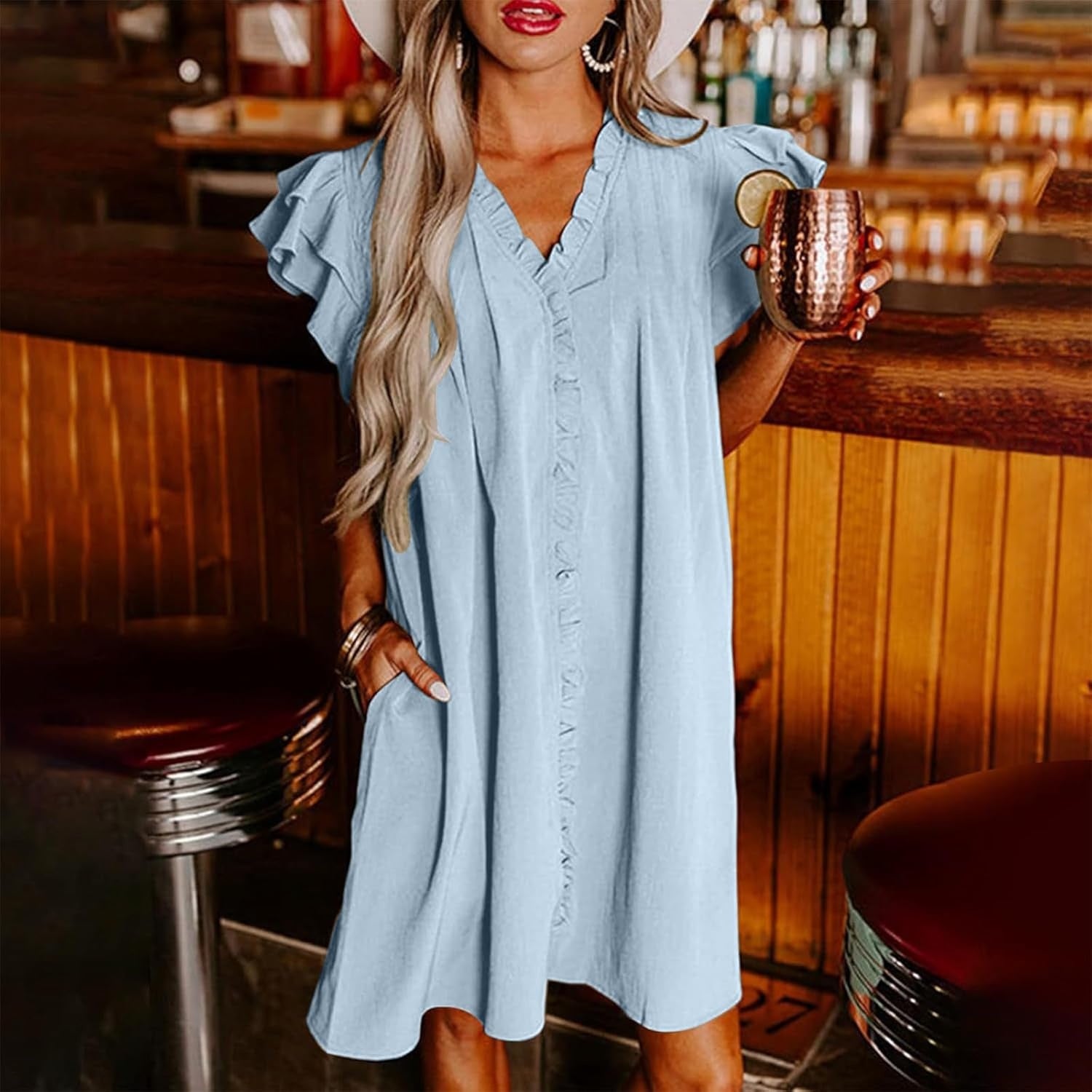 CHIC V-NECK AND RUFFLE-SLEEVE: Chic V-neck elongates your frame while the ruffled sleeves add playful femininity, creating a balanced look that's both polished and comfortably casual.