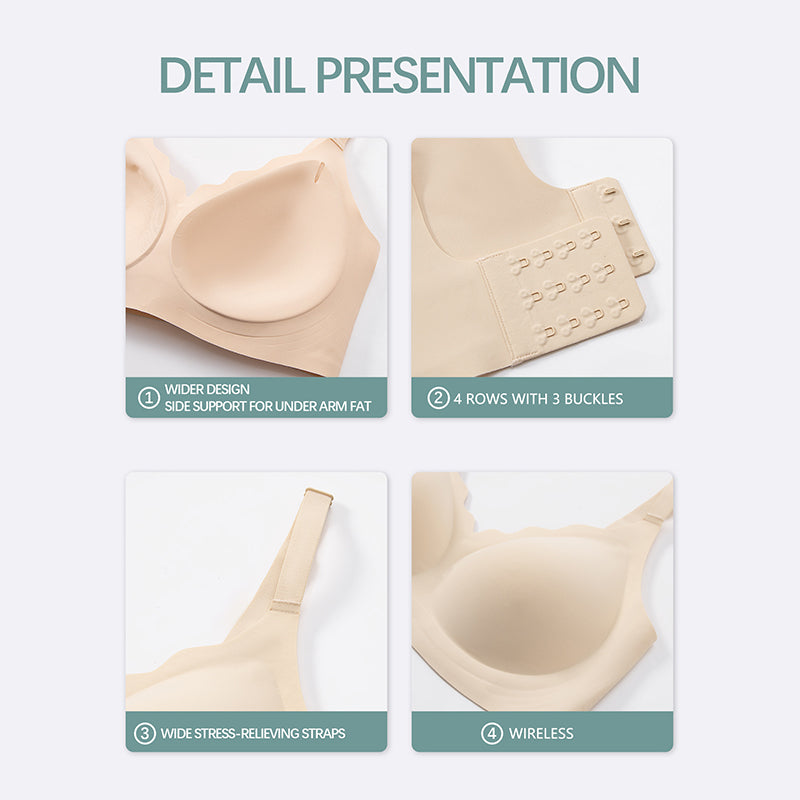 HIGH-ELASTICITY ADJUSTABLE STRAPS: Featuring adjustable, high-stretch shoulder straps, this bra offers a snug yet gentle fit, preventing shoulder strain and enhancing overall comfort. The secure 4-row, 3-buckle closure adds extra support.