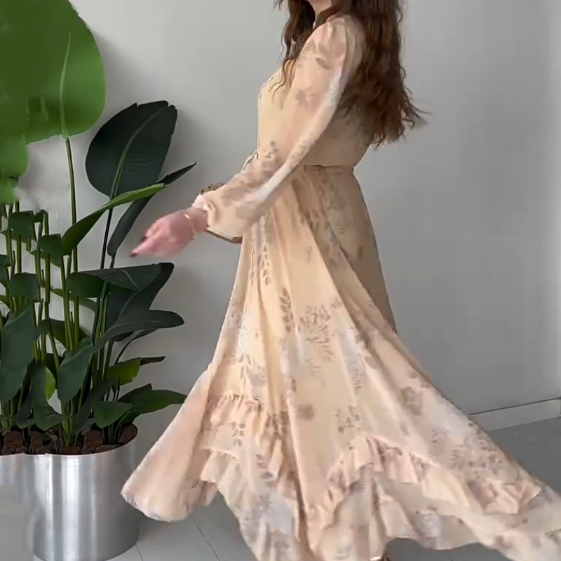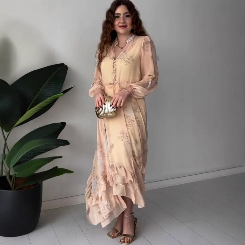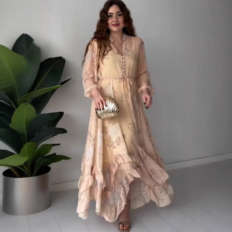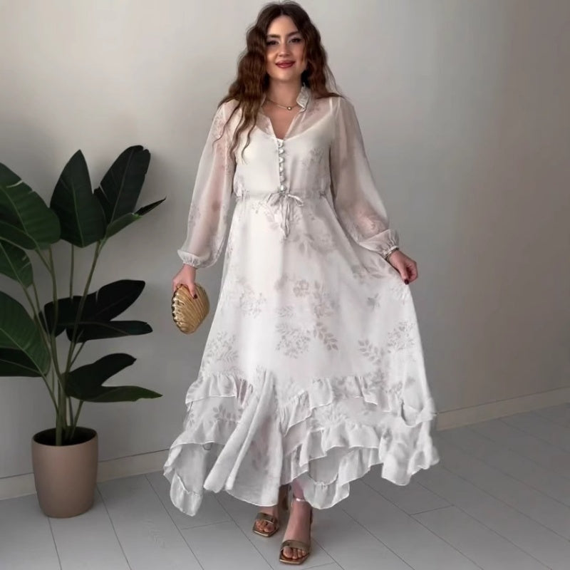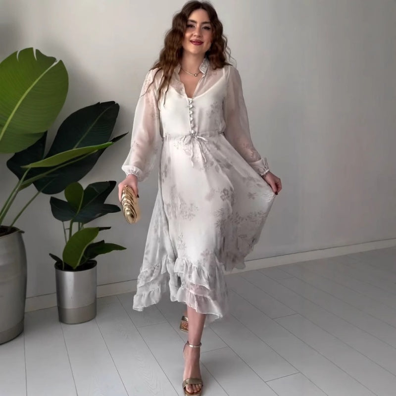 Women's Elegant Mesh Long-Sleeve Floral Drawstring Dress
