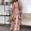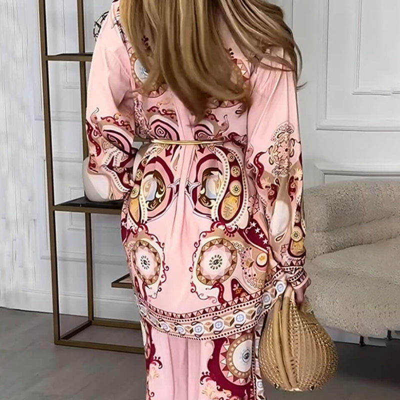 STUNNING ETHNIC PRINT DESIGN: Elevate your wardrobe with this eye-catching 2-piece set featuring intricate ethnic prints. The long-sleeve top boasts a classic collar and multi-button front, while the wide-leg pants include functional pockets for a blend of style and practicality.