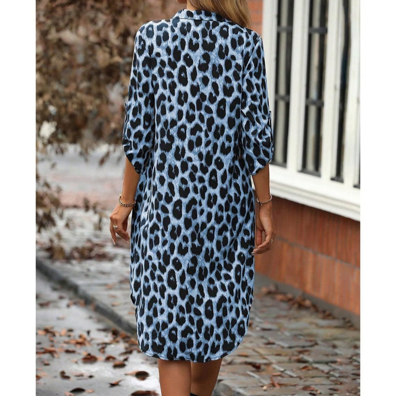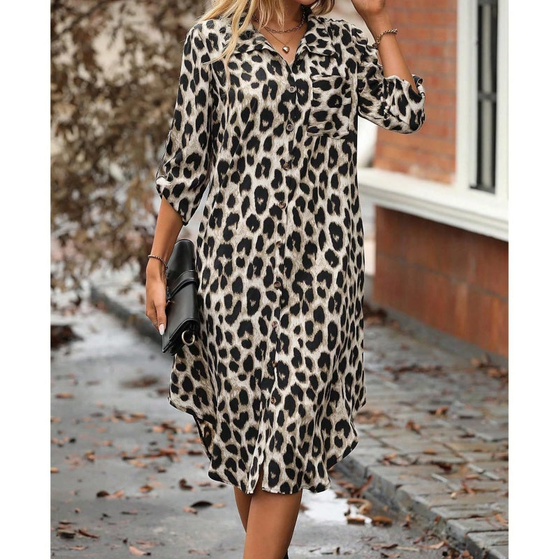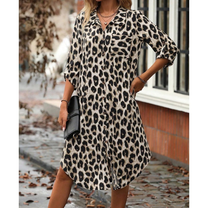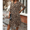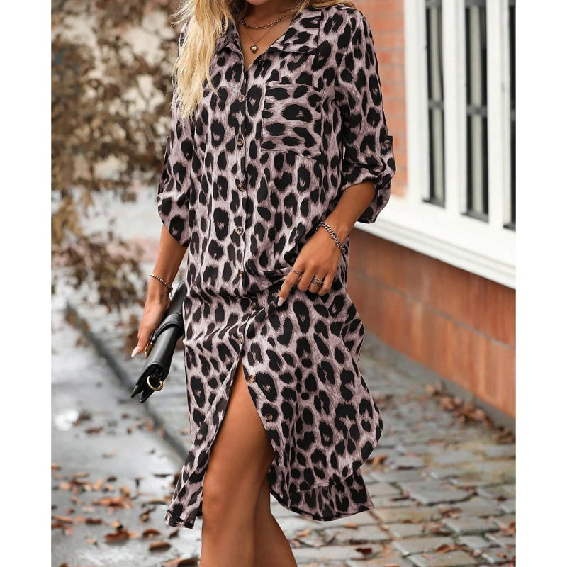Women's Leopard Button Front Rolled Sleeve Midi Dresses