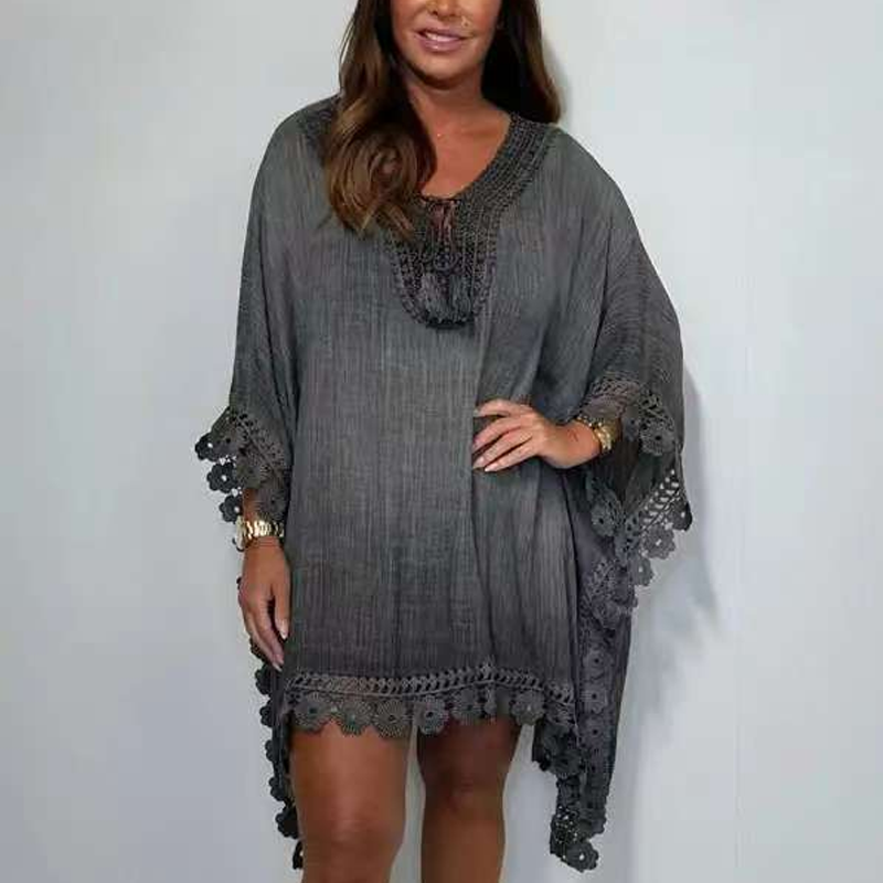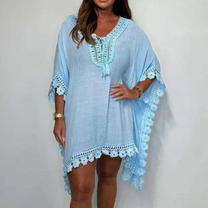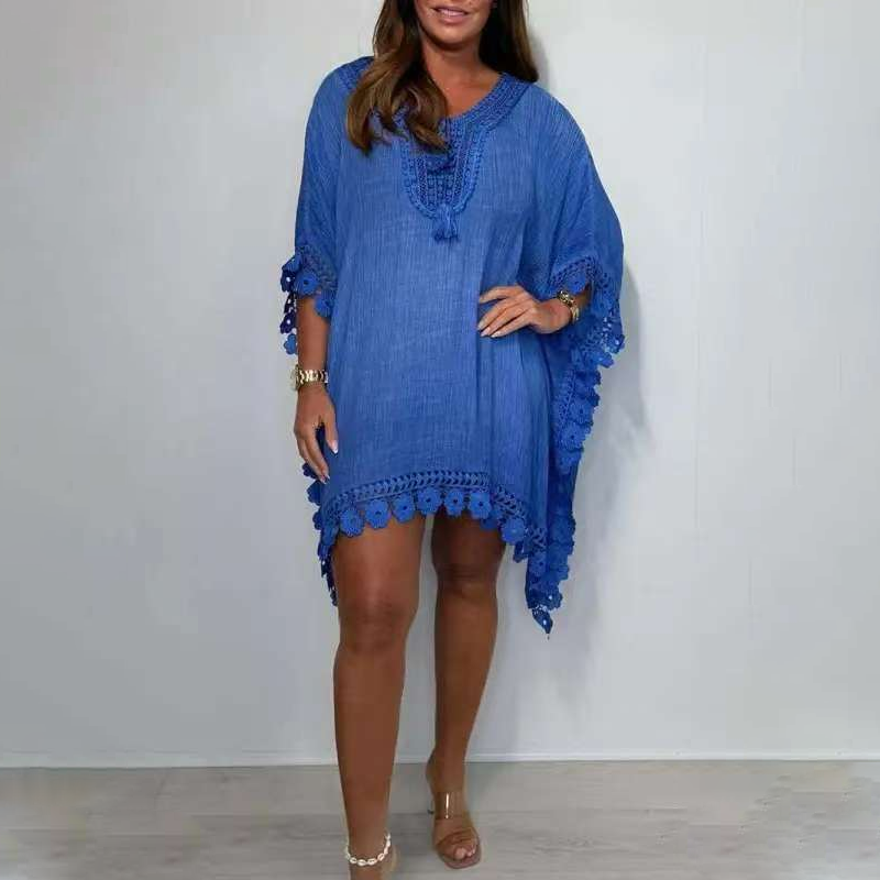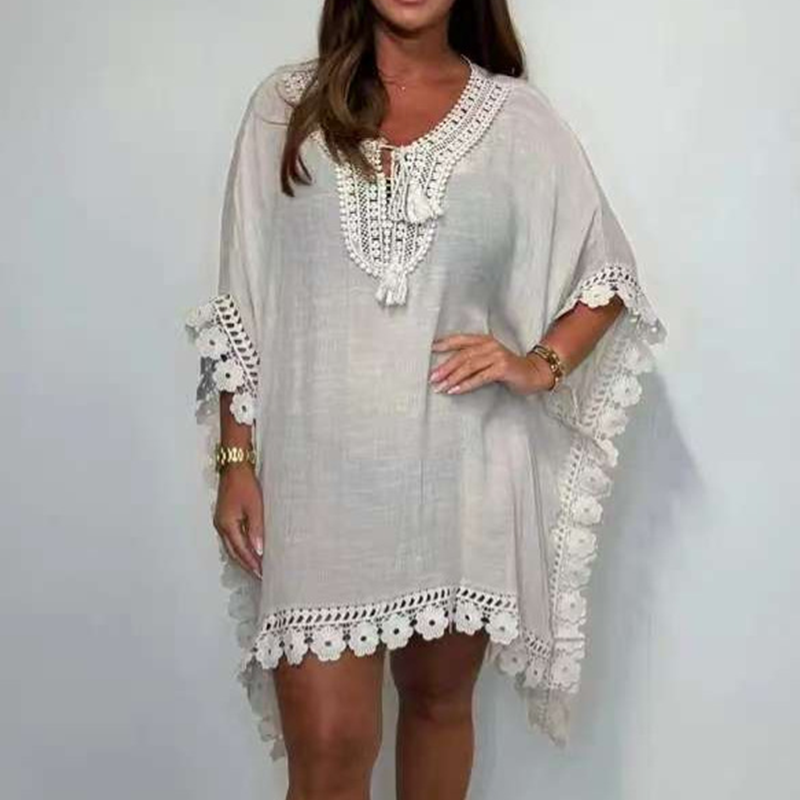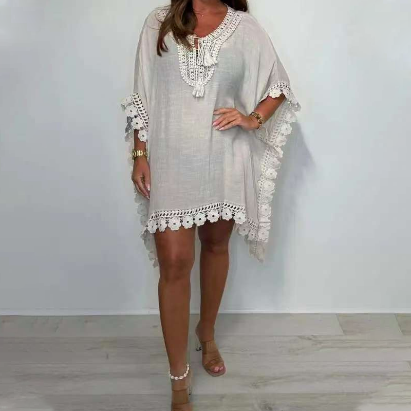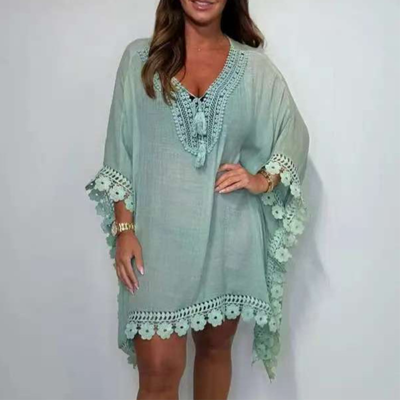 FASHION-FORWARD DESIGN: Elevate your wardrobe with this trendy mini dress. The unique V-neck and flowing sleeves create a flattering silhouette, while delicate floral crochet trim adds a touch of feminine charm. Perfect for those who want to stand out with effortless style.