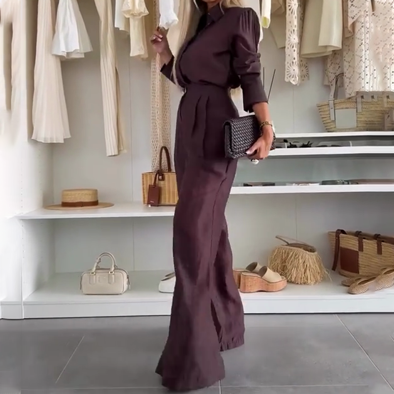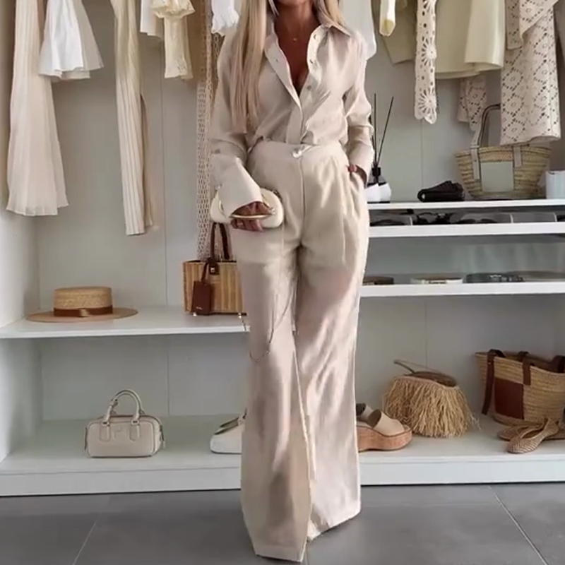 EFFORTLESS CHIC LOOK – The oversized sheer shirt adds a touch of elegance, while the wide-leg pants offer comfort with a relaxed silhouette.
