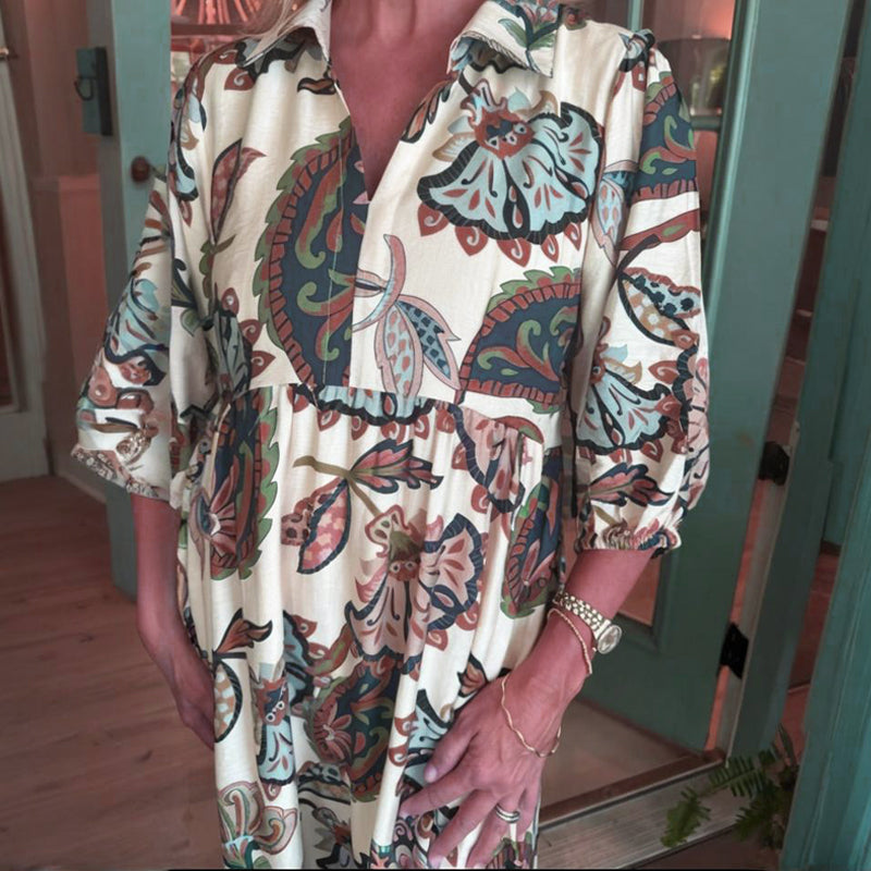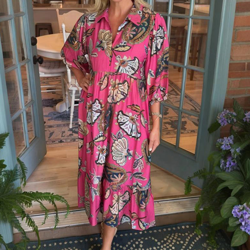 Women's Vintage Print V-Neck Loose Fit Dress